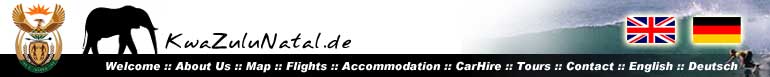 | Welcome :: About Us :: Map :: Flight :: Accommodation :: Car Hire :: Tours :: Contact :: English :: Deutsch Durban :: South Coast & Dolphin Coast :: Midlands & Drakensberg :: Battlefields :: Zululand & North Coast | ||